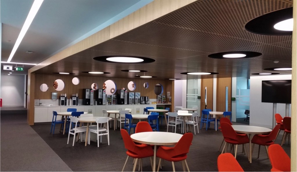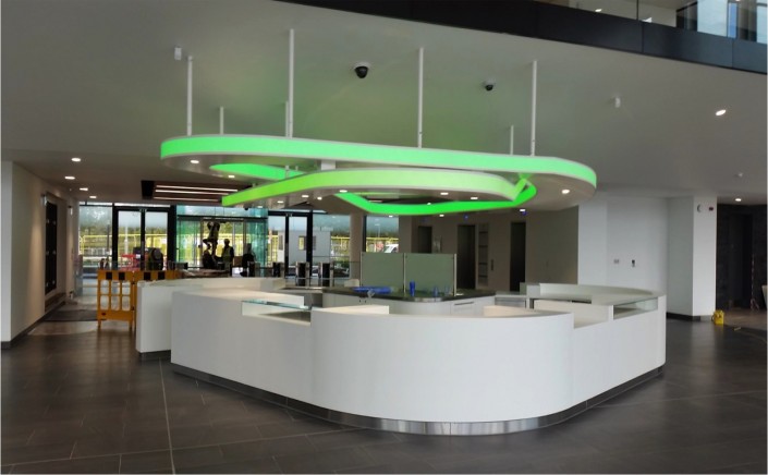 Works include feature ceiling light sculpture to the reception and vend reception area including desk, wall paneling , joinery ceilings to vending and breakout enclosures, door-sets, vend areas