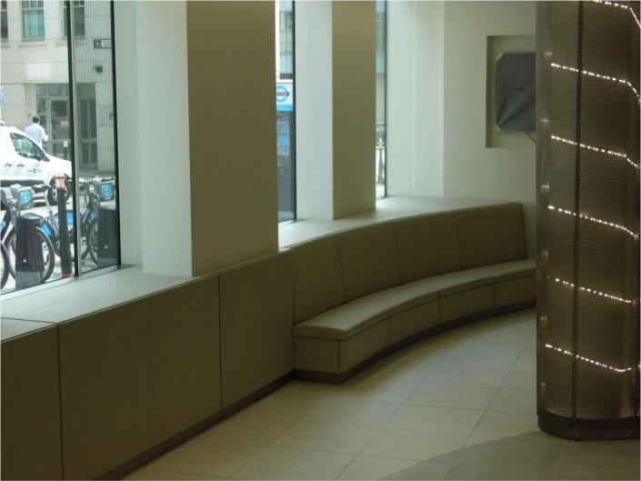 Works include reception desk, leather wrapped reception paneling, credenzas, vending areas, copy areas, door-sets, wall paneling , tea points, breakout areas, coat cupboards, booth seating, chain mail screening, leather curved seating.